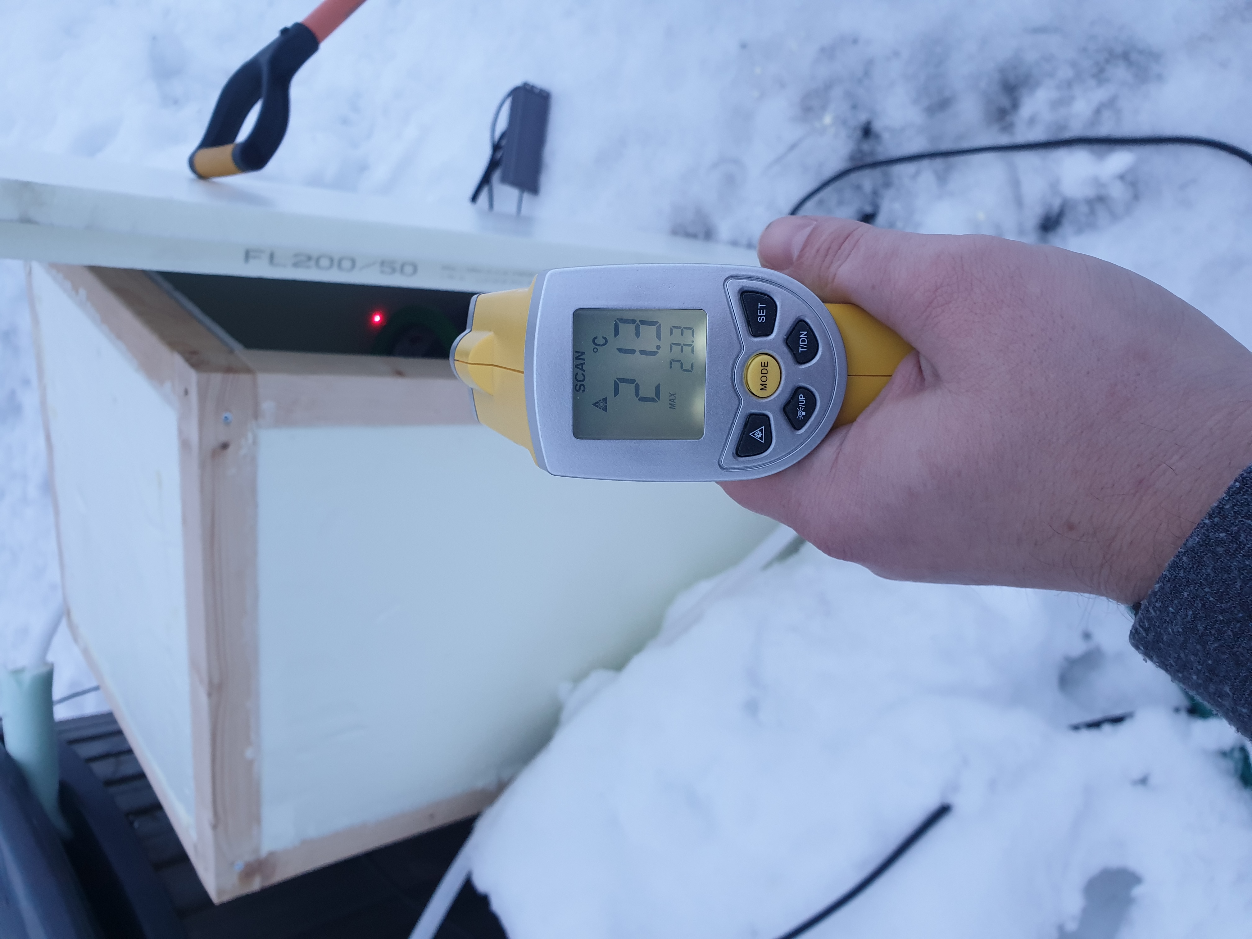 Seuraava testi tulikin, kun ulkolämpötila oli 0 asteen tienoilla ja kaappi oli puolittain valmis. Iskin eristettyyn kaappiin kaminan ja pullon lisäksi myös auton sisätilanlämmittimen ja pistin kaikki hyrisemään. Tällä kertaa ei ainakaan pullon jäätymisestä olisi pelkoa (tai näin luulin).